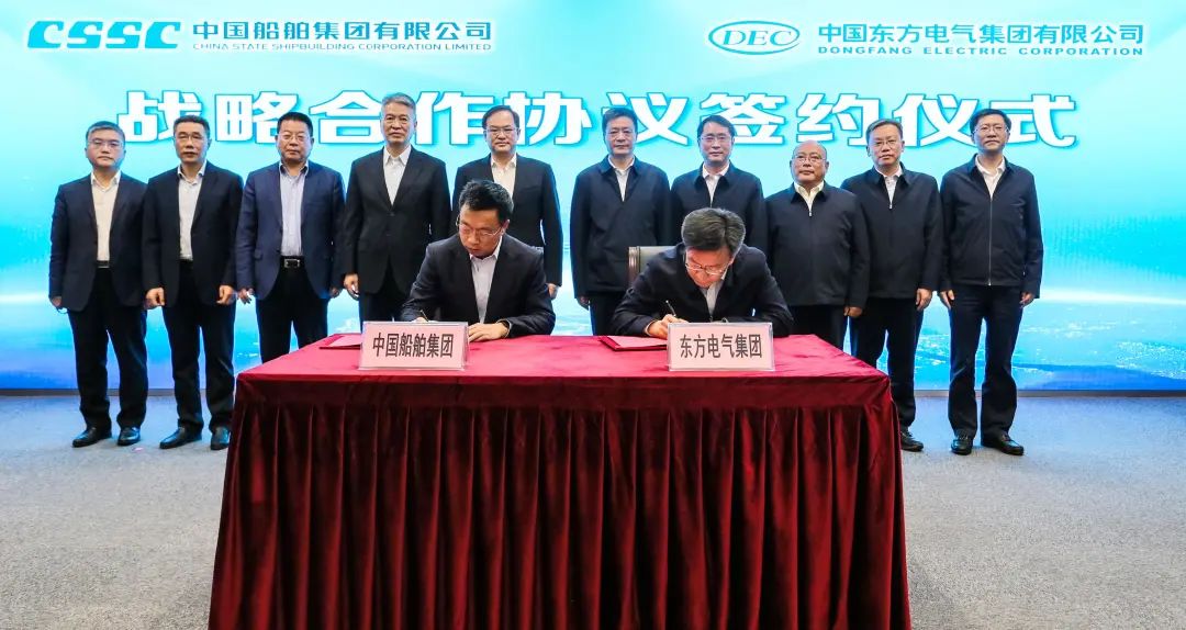 党组成员、副总经理李忠军,中国船舶集团党组成员、副总经理盛纪纲代表双方在战略合作协议上签字。
