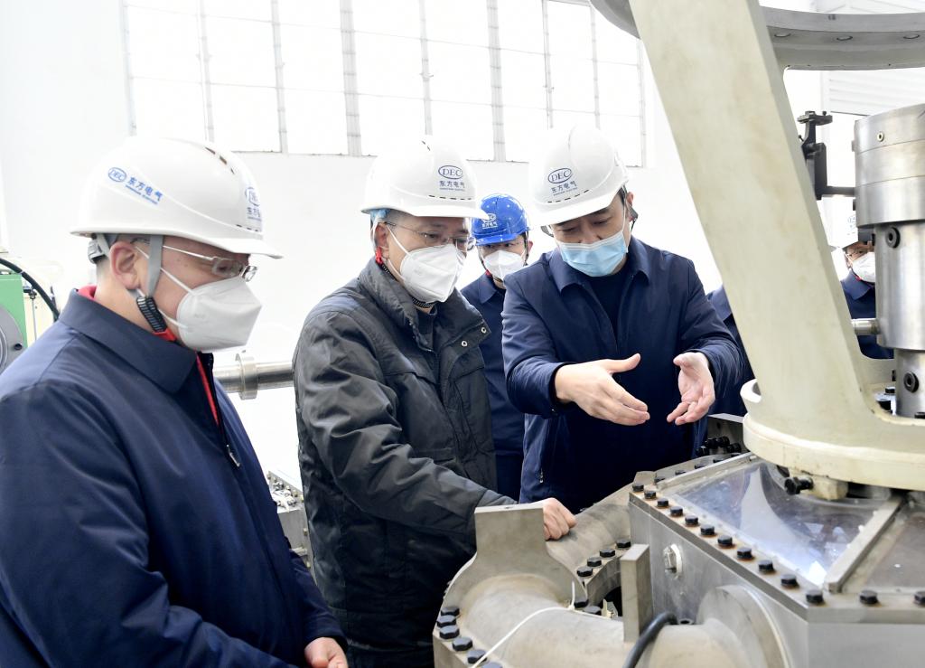 在东方电机,徐鹏深入企业智能冲击式水轮机模型试验台、金冲分厂、清洁能源装备重型制造数字化车间等地,详细了解企业科研攻关、数字化转型、绿色高端制造等情况。强调企业要加快实施创新驱动发展战略,以国家战略需求为导向,集聚力量进行原创性引领性科技攻关,把关键核心技术牢牢掌握在自己手中。要持续推动发展方式绿色转型,打造更多高端化、智能化清洁能源装备,着力推动高质量发展。