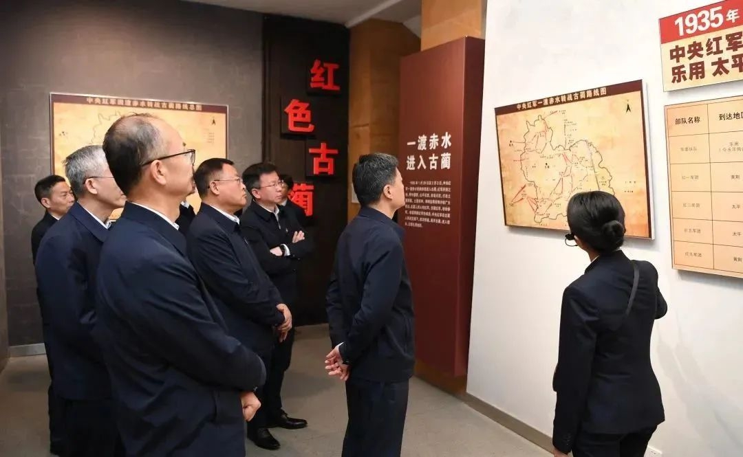 追寻红色足迹,俞培根一行来到中国工农红军四渡赤水太平渡陈列馆、毛泽东四渡赤水纪念馆等地,通过现场教学接受了一次全面而深刻的红色洗礼。在太平渡口纪念碑前,面对党旗,俞培根带领在场党员领导同志一起重温入党誓词。在俞培根领誓下,铿锵有力的宣誓声响彻赤水河畔,让现场所有人都深受感染,不断叩问初心、守护初心,不断坚守使命、担当使命,始终做到初心如磐、使命在肩。