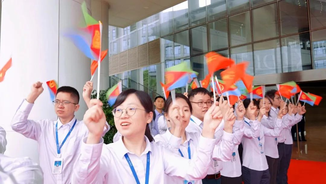 青年代表排列整齐,热情挥舞着中厄两国国旗,热烈表达着对伊萨亚斯一行的欢迎之情。