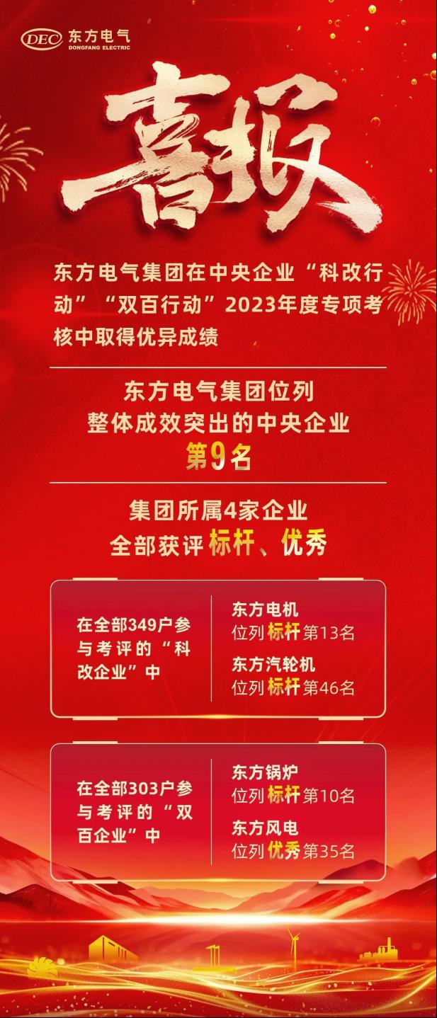 所属4家企业均取得优异成绩,其中东方电机、东方汽轮机分别位列“科改行动”标杆企业第13名、标杆企业第46名,东方锅炉、东方风电分别位列“双百行动”标杆企业第10名、优秀企业第35名。