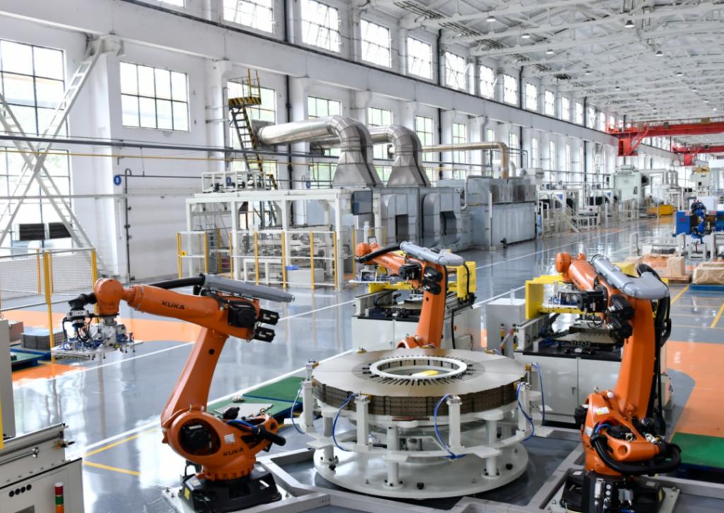 以数字化引领绿色发展,坚持“产品智能化和制造智能化”双轮驱动,加大工业机器人应用力度,大力推进绿色示范车间、绿色示范工厂创建,着力提高生产领域节能降碳水平。图为行业首个定子冲片绿色“无人车间”。C7娱乐